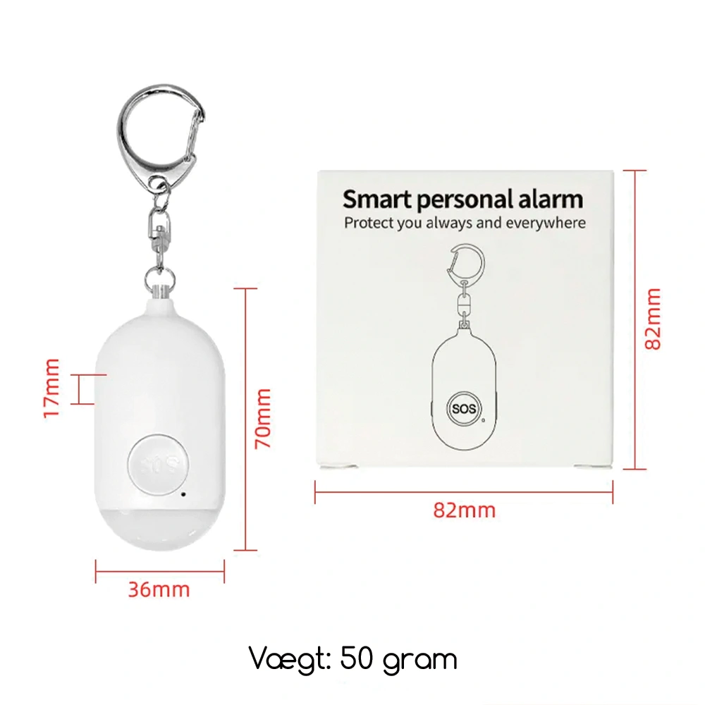 7. Lille og kompakt design: Overfaldsalarmens lette og kompakte design gør det nemt at have den med dig overalt. Den diskrete størrelse gør det muligt at bære den i lommen eller i tasken uden besvær.