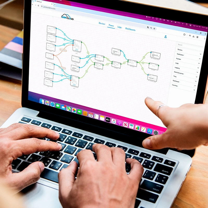 • Nem programmering via FLOW på cloud server, hvor man selv virtuelt koder sin enhed. Her kan også laves Logs, så man kan se hvornår der har været alarm mm.