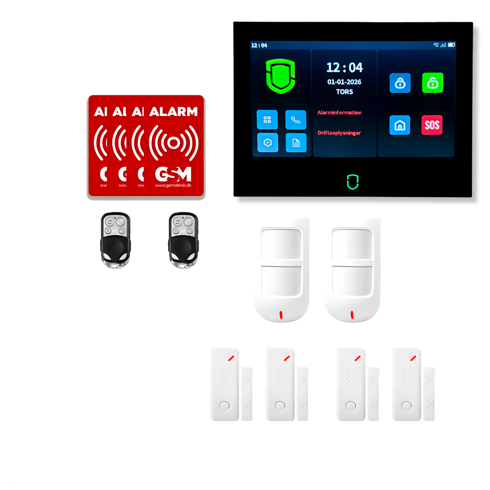 Systemet leveres komplet og færdigopsat. Alt tilbehør er allerede kodet, så du kun skal tilslutte alarmpanelet og montere sensorerne. På under en time har du et alarmsystem, der er klar til at beskytte din bolig.